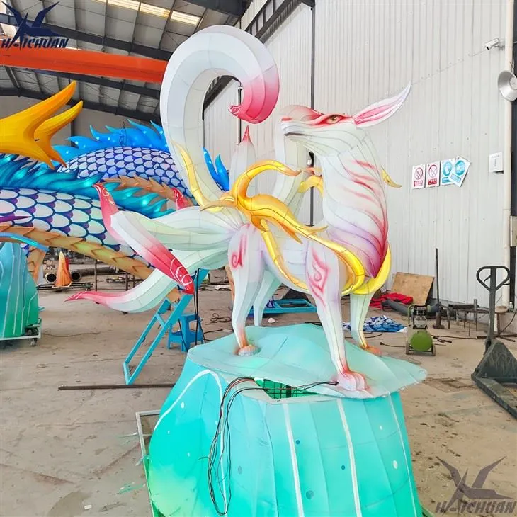 Makhluk mitos Tiongkok berbentuk seperti rubah dengan sembilan ekor. Kami menggunakan kawat besi tebal dan rangka baja yang mengelas bentuk rubah berekor sembilan, dipasang pada bentuknya dengan sabuk lampu yang dapat berubah warna, permukaan tubuh dengan ikatan sutra, dan akhirnya pelukis profesional akan membuat rubah berekor sembilan ini lebih pintar dan cantik.